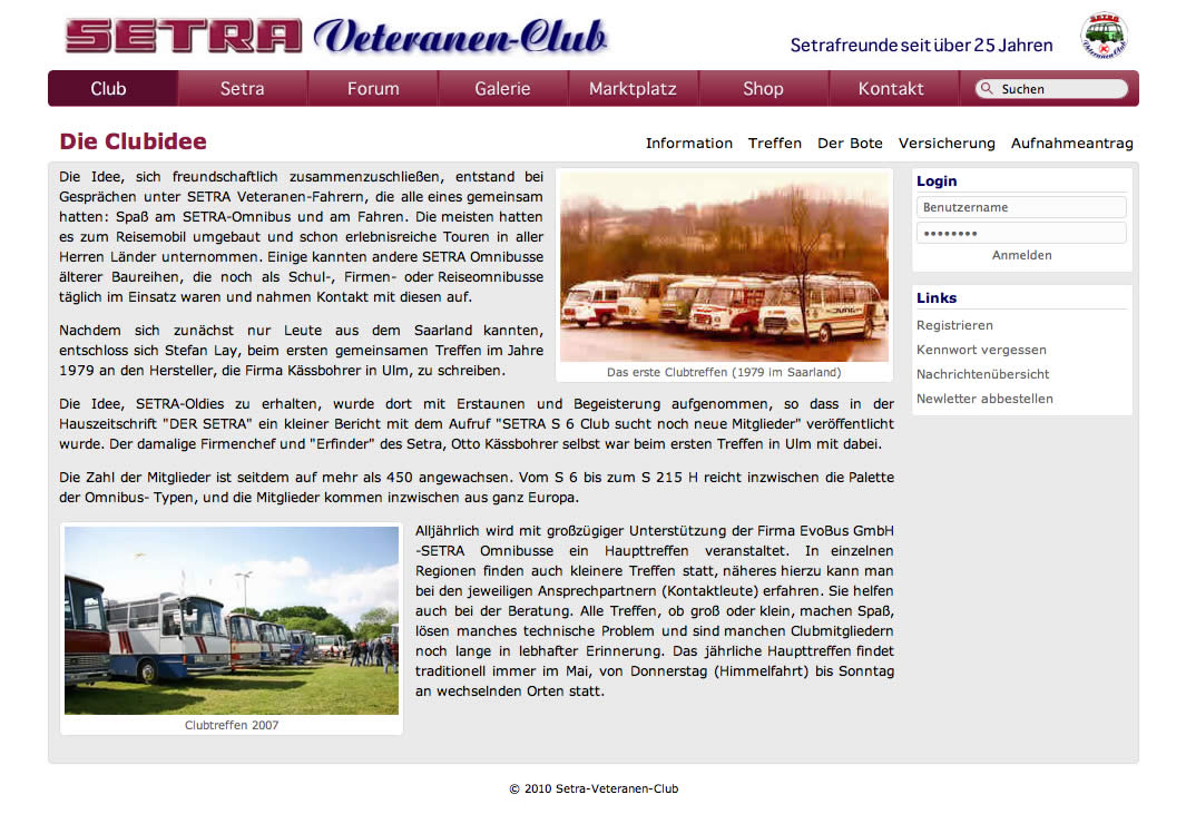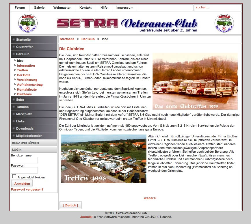 Da außer mir auch noch andere Mitglieder auf die Gestaltung der Inhalte unserer Webseite Einfluss nehmen, um z.B. die Busanzeigen online zu stellen, kam im Laufe des Jahres der Gedanke zu einem sog. Content Management System (CMS) auf. Die Wahl fiel damals auf Joomla, ein Programm, das, wie sich später herausstellte, alles andere als einfach und logisch zu bedienen war. So wurde Mitte 2007 die gesamte Seite auf Joomla umgestellt.