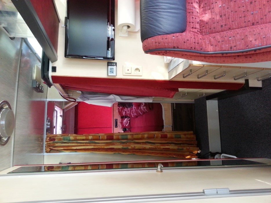 Des Weiteren haben wir bereits bei der Planung den Betrieb des Fahrzeugs auf reinen Sommerbetrieb (April bis September) festgelegt und aus diesem Grund auf den Einbau einer Gasanlage verzichtet und somit auch keine Gasheizung im Fahrzeug. Bei kühlen Nächten kann mit einem Keramiklüfter geheizt werden (allerdings nur bei Landstromversorgung). Gekocht haben wir mit einer mobilen Induktionsplatte.